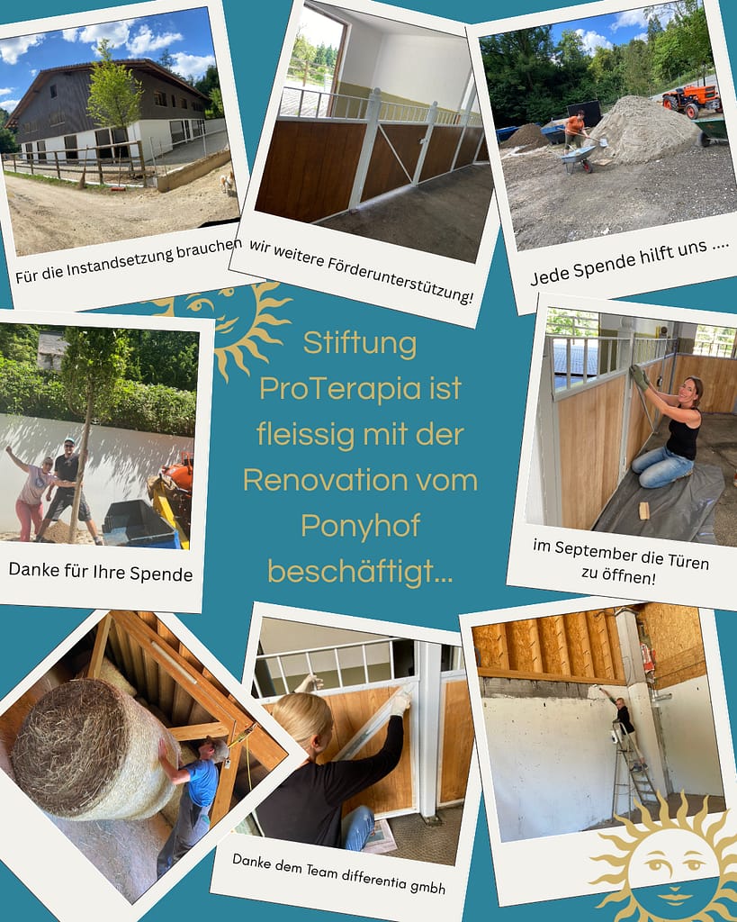 Wir arbeiten auf Hochtouren an der Instandsetzung des Ponyhofs und sind dringend auf weitere Zuschüsse und Spenden angewiesen. Helfen Sie uns, das neue Therapie- und Begegnungszentrum differentia in Reinach BL zu realisieren. Wir suchen auch engagierte Baufirmen und Kleinunternehmen, die Interesse haben, unser Projekt mit günstigen Renovationsangeboten zu unterstützen. Wir laden Sie herzlich ein, mit uns Kontakt aufzunehmen, um mögliche Kooperationen zu besprechen.